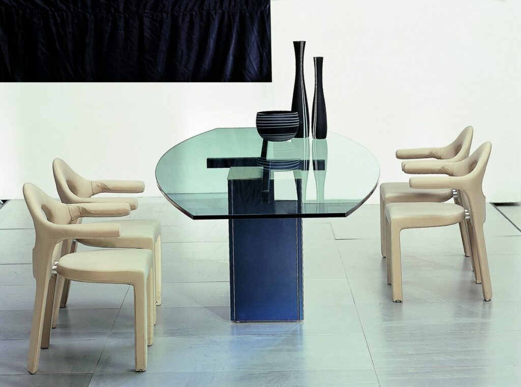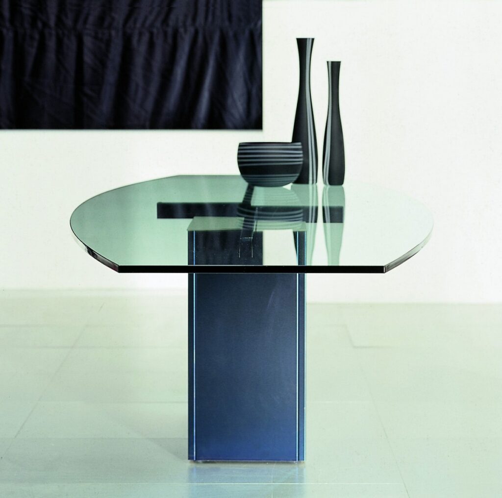 Dining and meeting table with glass top and wooden base. The top can be made in many different sizes and shapes, in crystal or sand-blasted glass. The base can be done in natural or colour laquered wood.