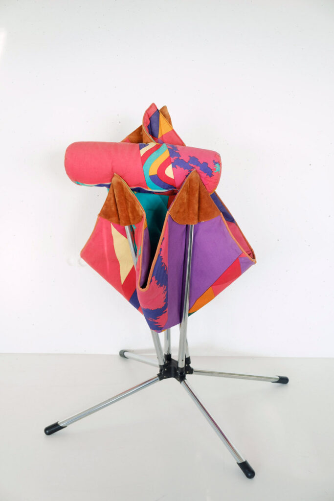 The seat was originally made with the multi-colored fabrics designed by Ottavio and Rosita Missoni Saporiti Italia. It can be now made with all the fabrics and leathers of the Saporiti Italia collection.