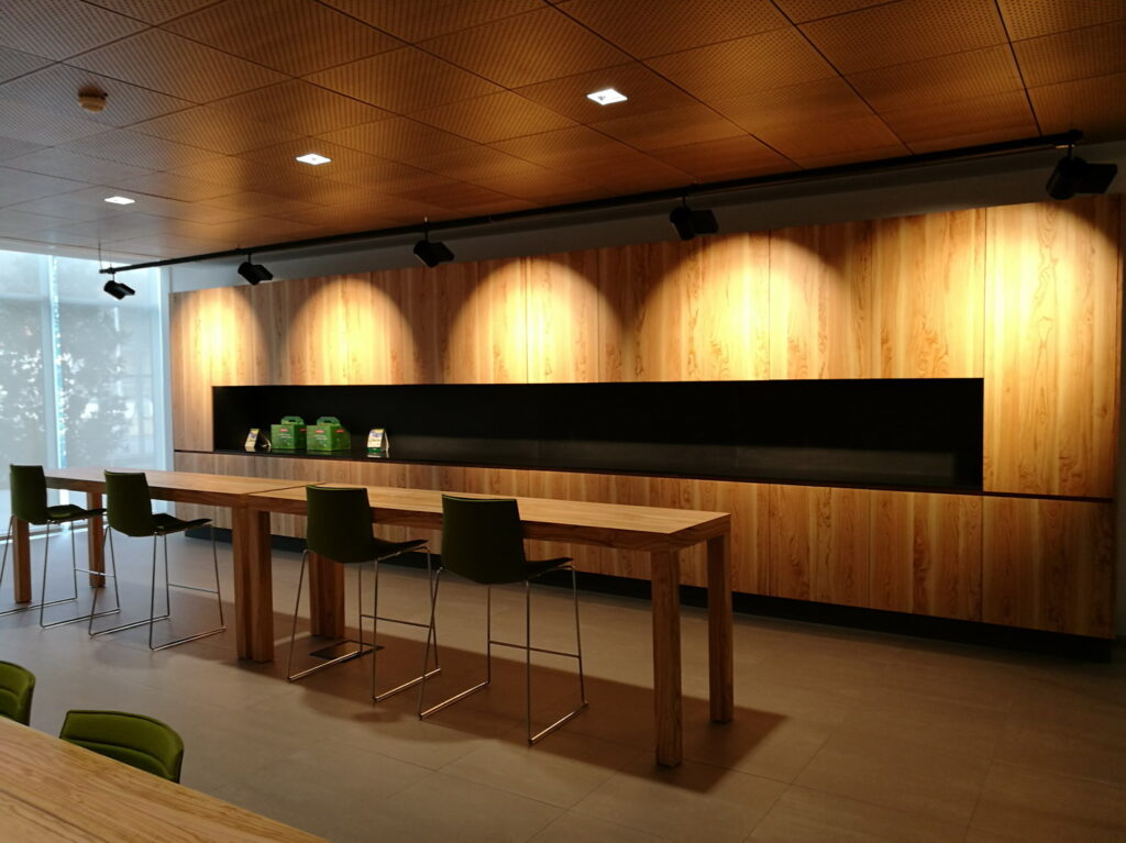 The board-room table has been designed by Saporiti Italia to recall the leaves of the date-palm tree, a fruit at the origins of Noberasco’s history, with sophisticated inlays of dark and light oak veneers.